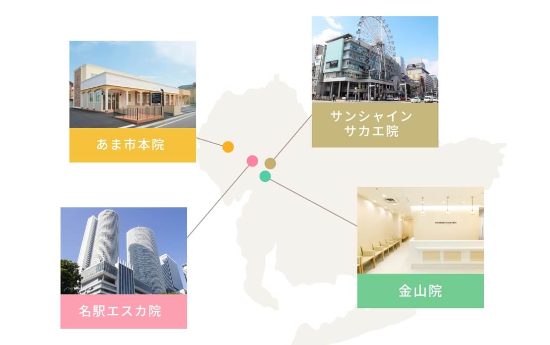 当院はあま市の本院のほか、名駅、栄、金山といった名古屋都心にクリニックを展開しています。