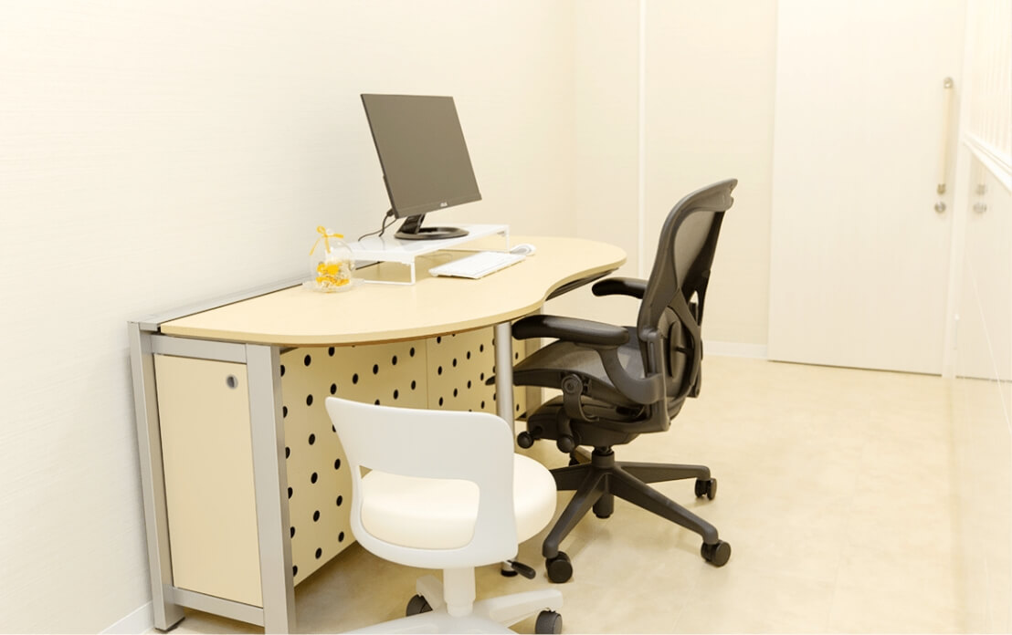 当院は、医師が診療していただきやすいよう、診察室内の椅子にこだわるなど診療環境も大切にしております。また、チームで医師の診療をしっかりとサポートできるように、医療事務や医療秘書が担当で医師につき、精神保健福祉士や心理士、看護師が専門職として診療に携わることで先生の診療を支えています。